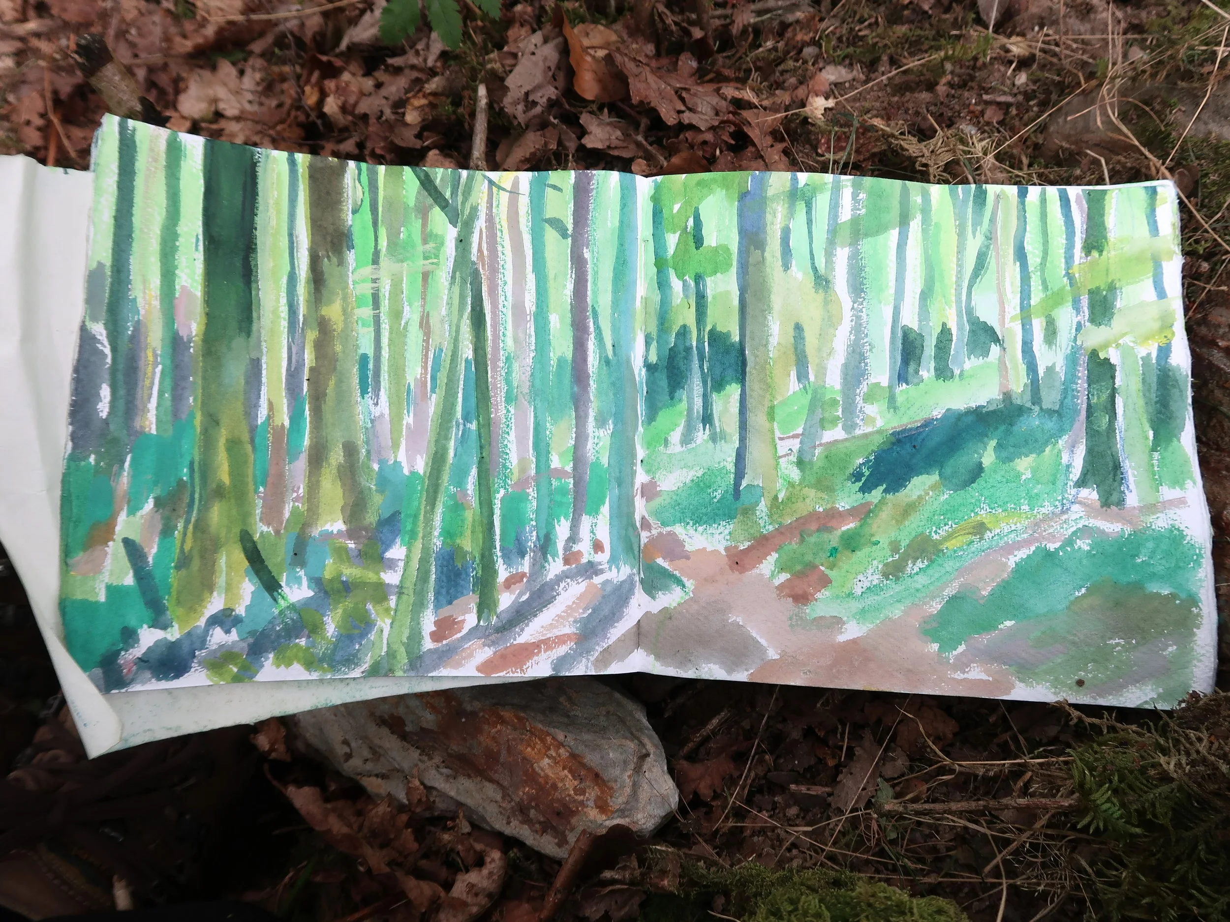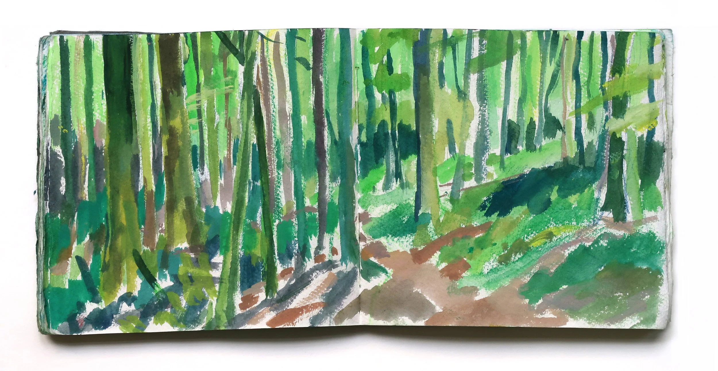 Into the Trees, gouache and pastel in paper 21 x 42 cm, 2025, sketchbook