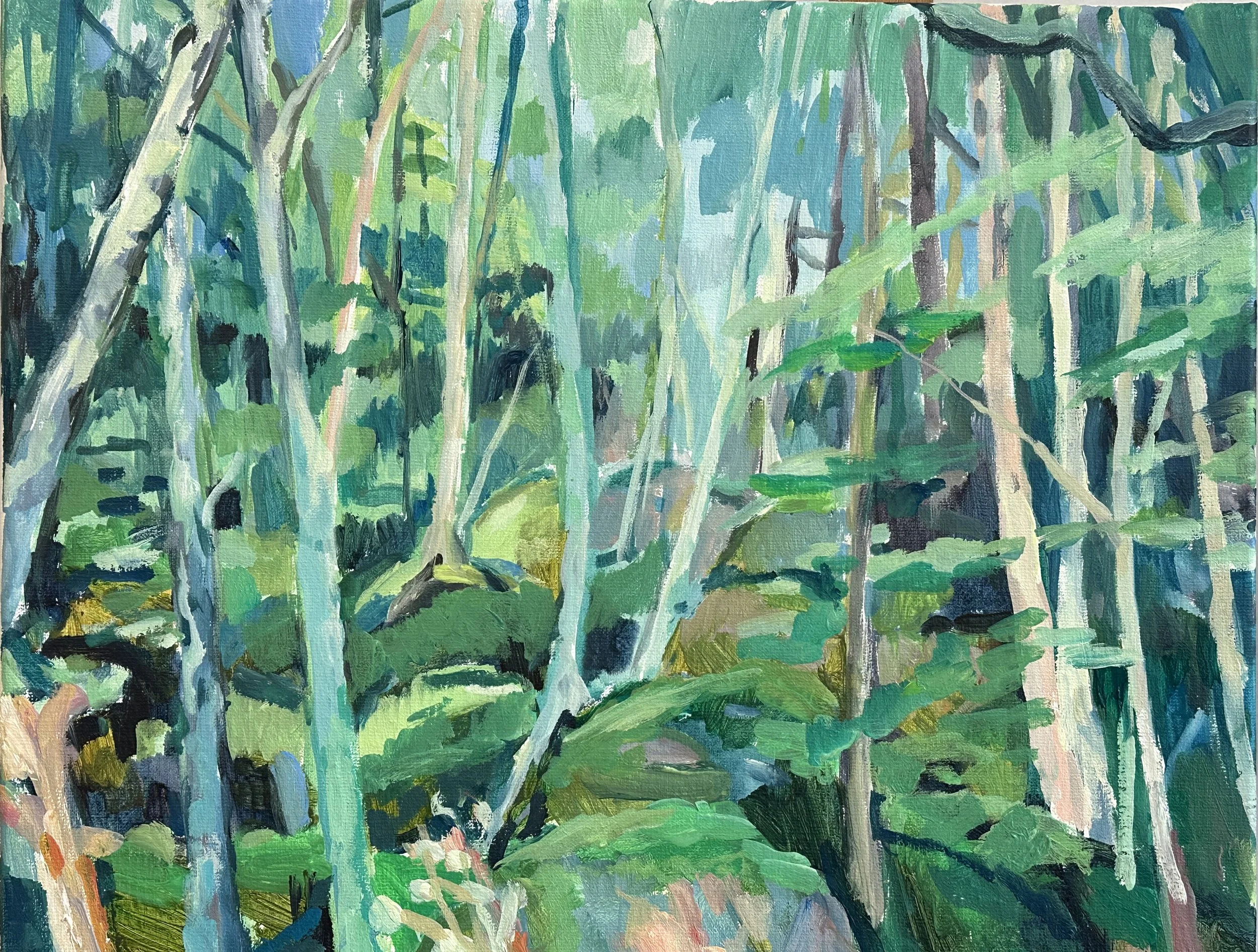 Into the Trees, acrylics & pastel on linnen, 40 x 50 cm, 2025, private collection