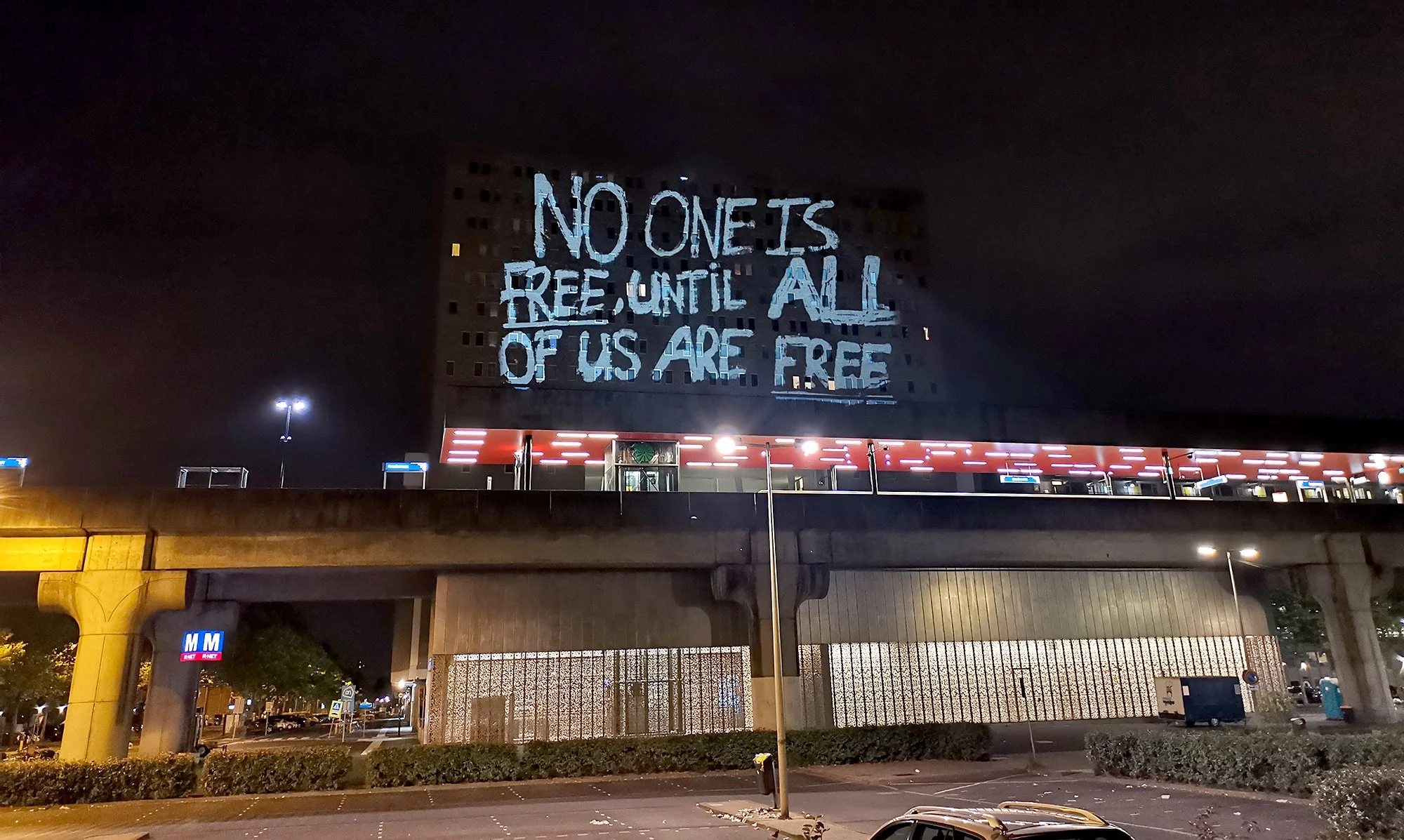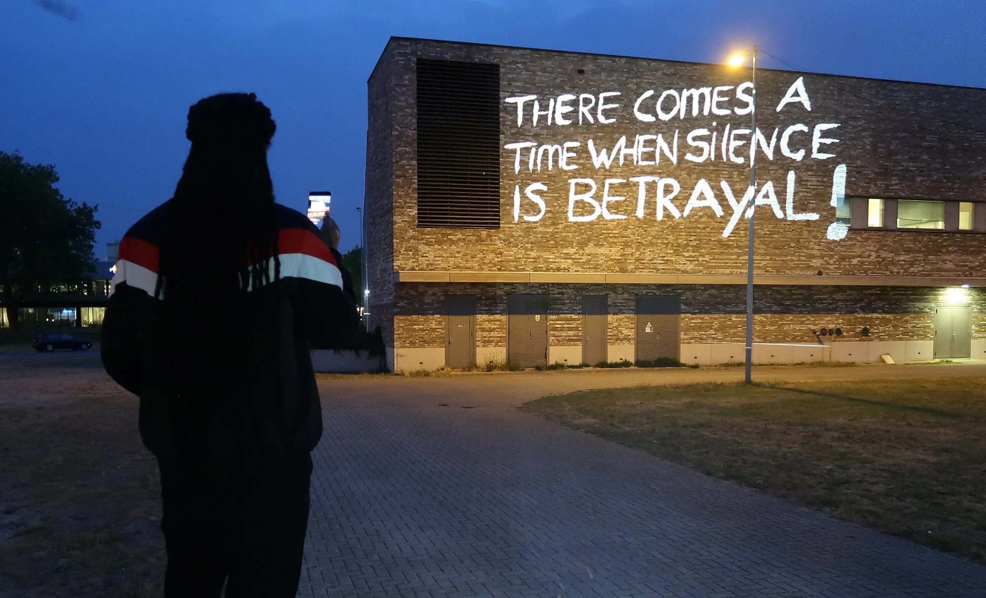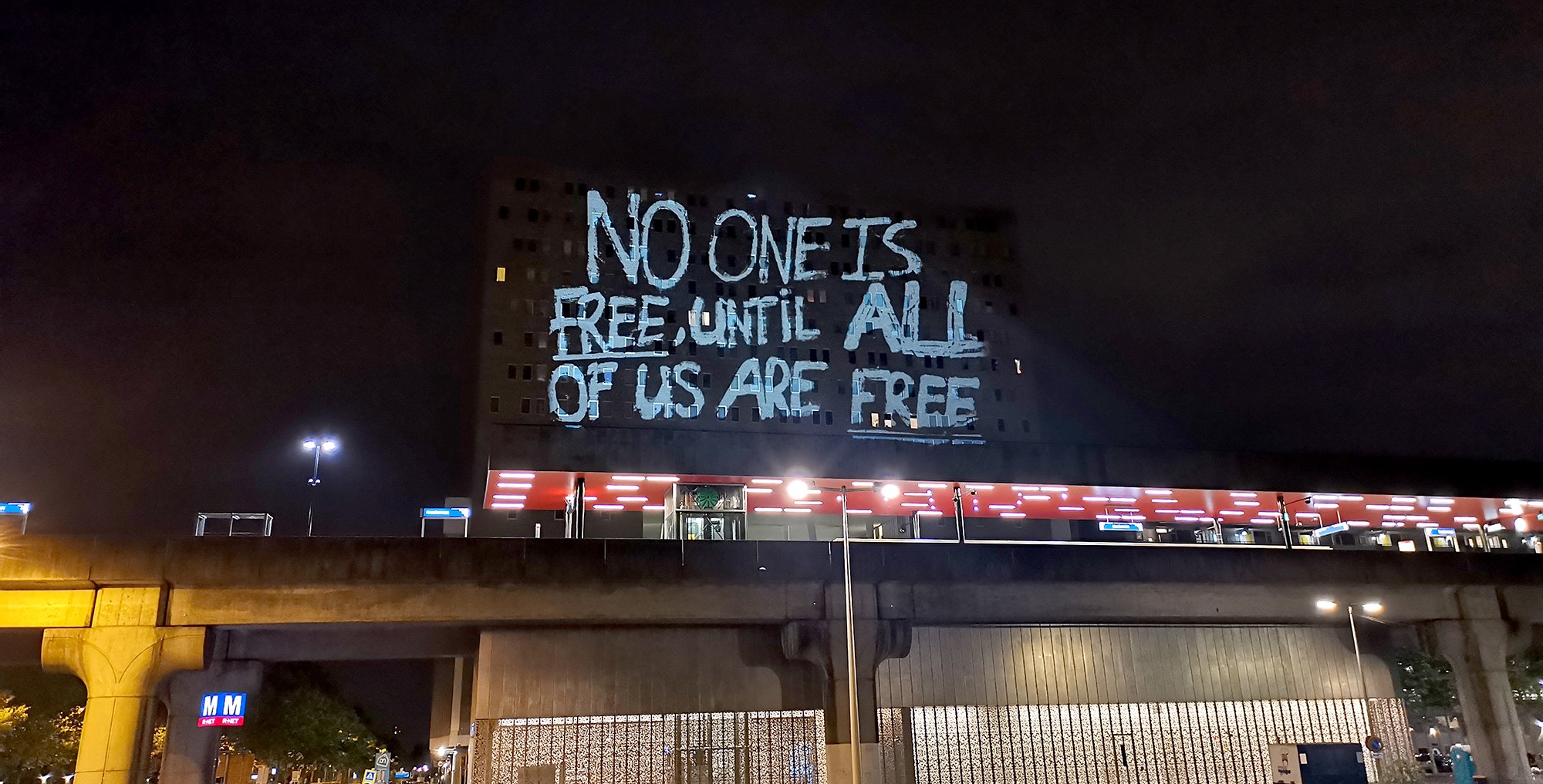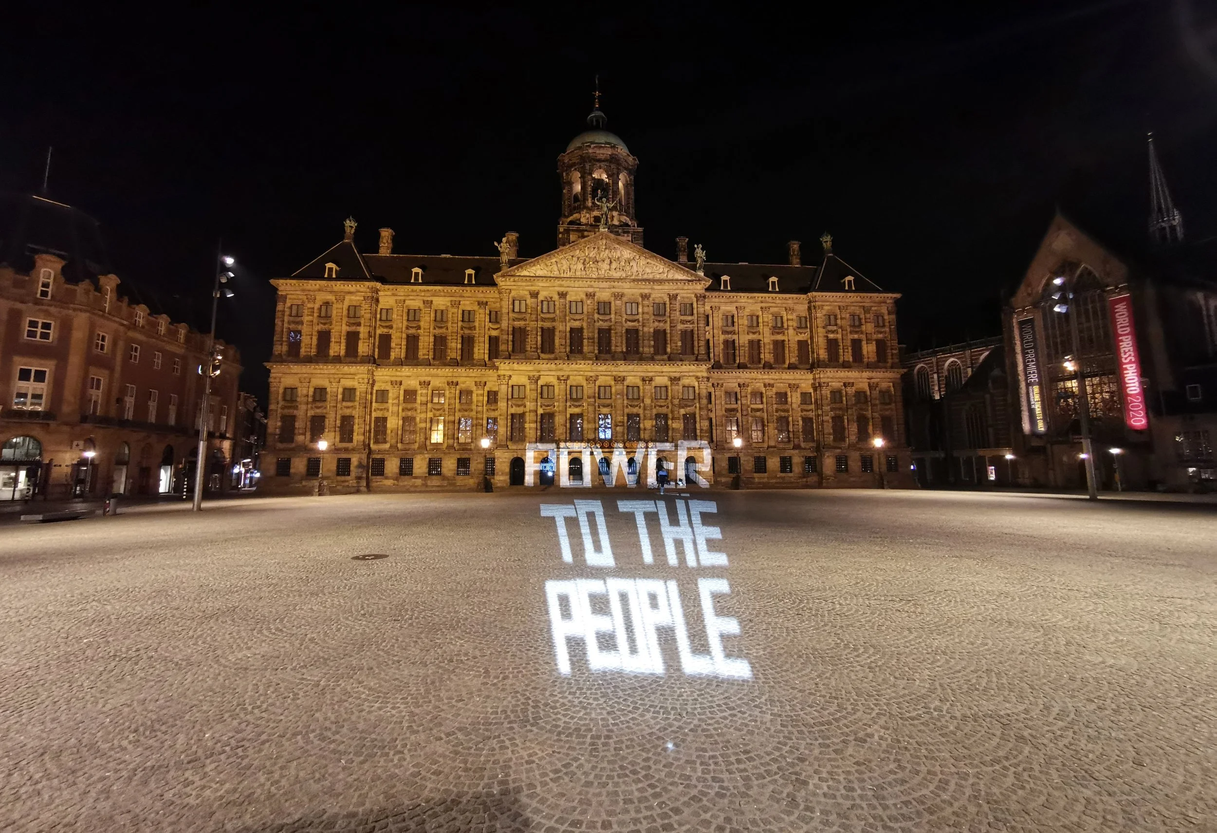 The signs were photographed and translated directly on location into large screen slides. Through guerrilla large screen light projection we projected the echo of the resistance in the silence of the city. The story of the protest signs became visible at the Bijlmerplein, the Kraaiennest and finally on the Royal Palace Amsterdam in the city center, where initially the protests had taken place. Thanks to a live-stream so many people were involved and interacted where to project.